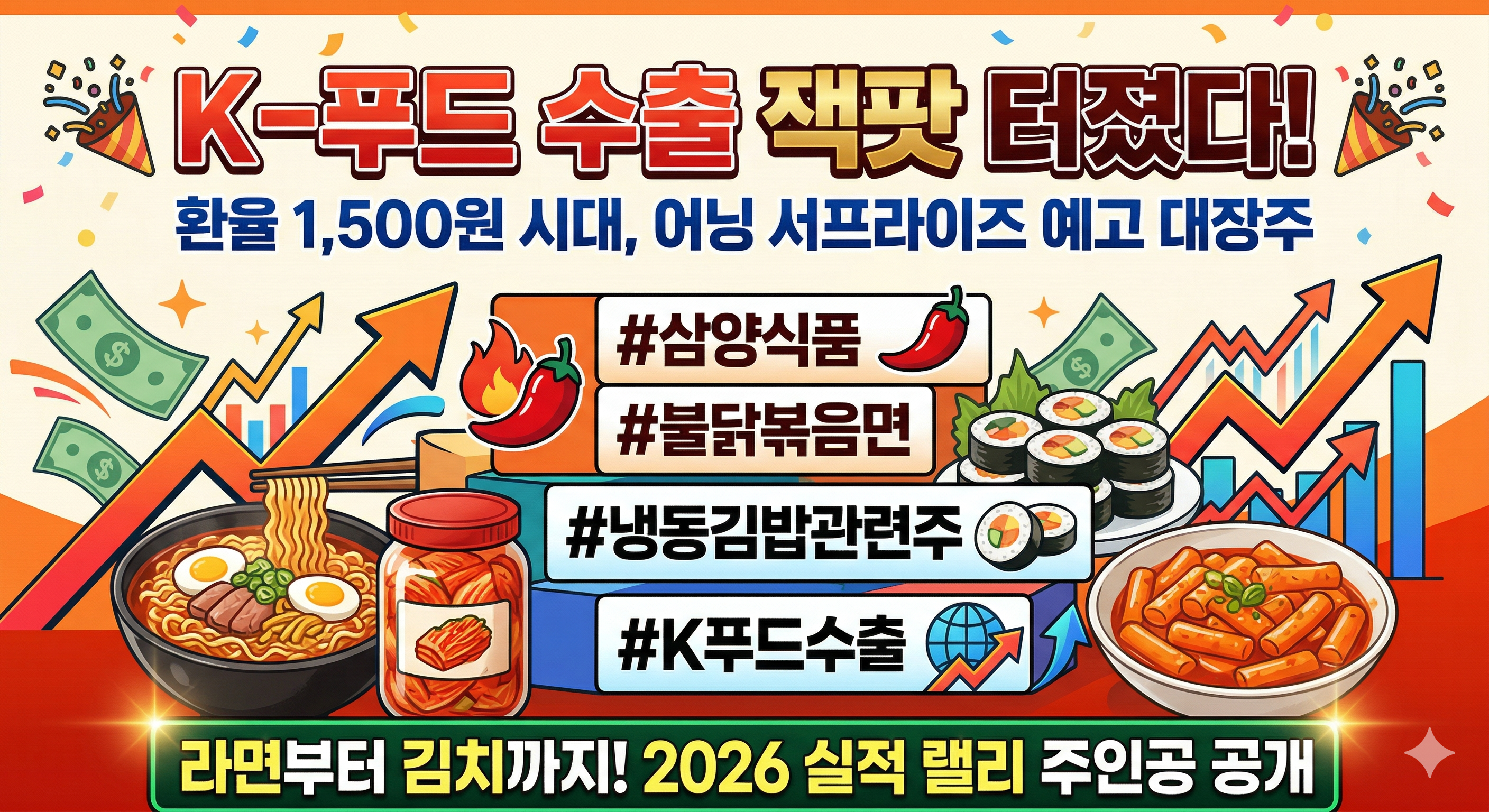 - 삼양식품 (003230): '불닭' 시리즈의 글로벌 열풍이 멈추지 않고 있습니다. 수출 비중이 70%를 상회하며 환율 수혜를 가장 직접적으로 입는 기업입니다.