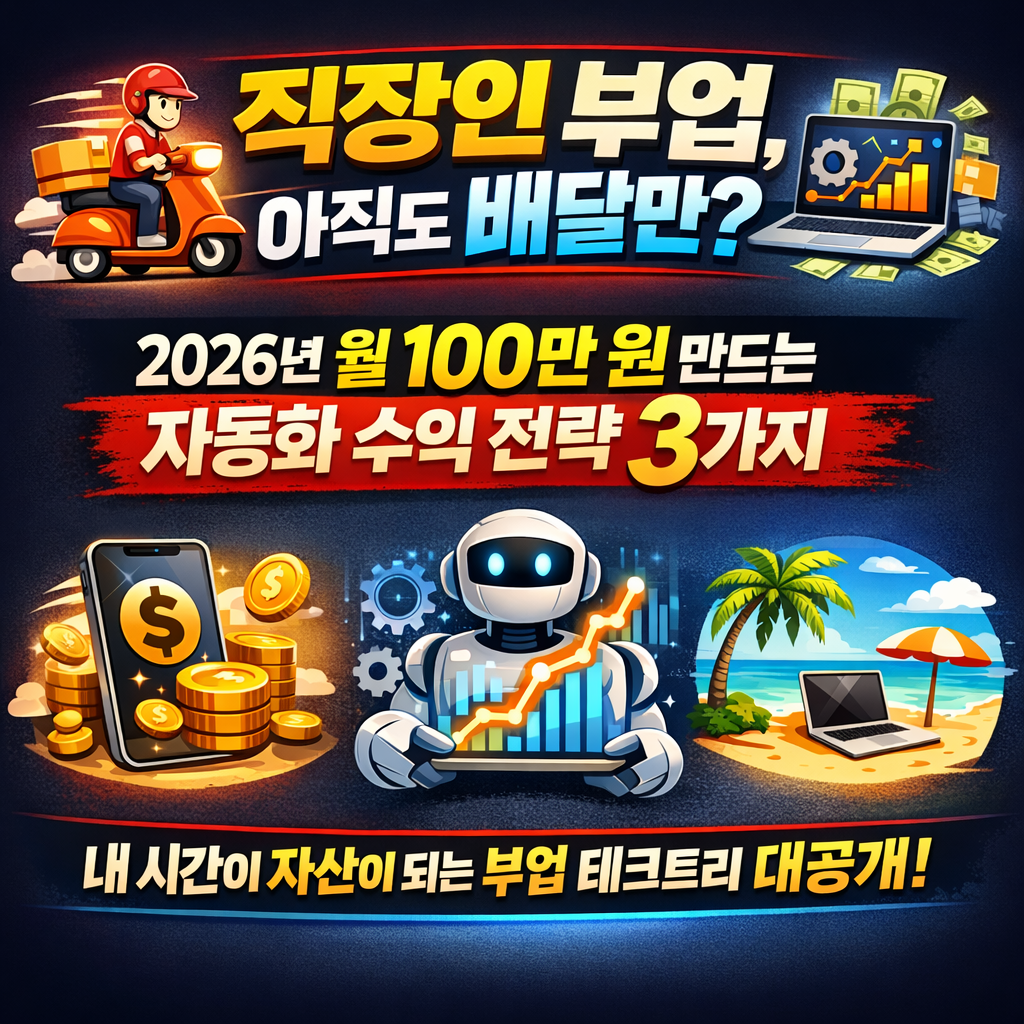 2026년 현재, 대한민국은 그야말로 '부업의 시대'입니다. 하지만 누구나 뛰어든다고 해서 누구나 돈을 벌 수 있는 것은 아닙니다. 유튜브, 블로그, 스마트스토어 등 이미 포화 상태인 레드오션 시장에서 평범한 직장인이 월급 외 수익 100만 원을 만들려면 이전과는 다른 '전략'이 필요합니다. 오늘은 지금 당장 시작할 수 있는 가장 현실적인 부업 루트를 정리해 드립니다. (출처: 통계청 경제활동인구조사 / N잡러 실태 보고서, 2026.03)