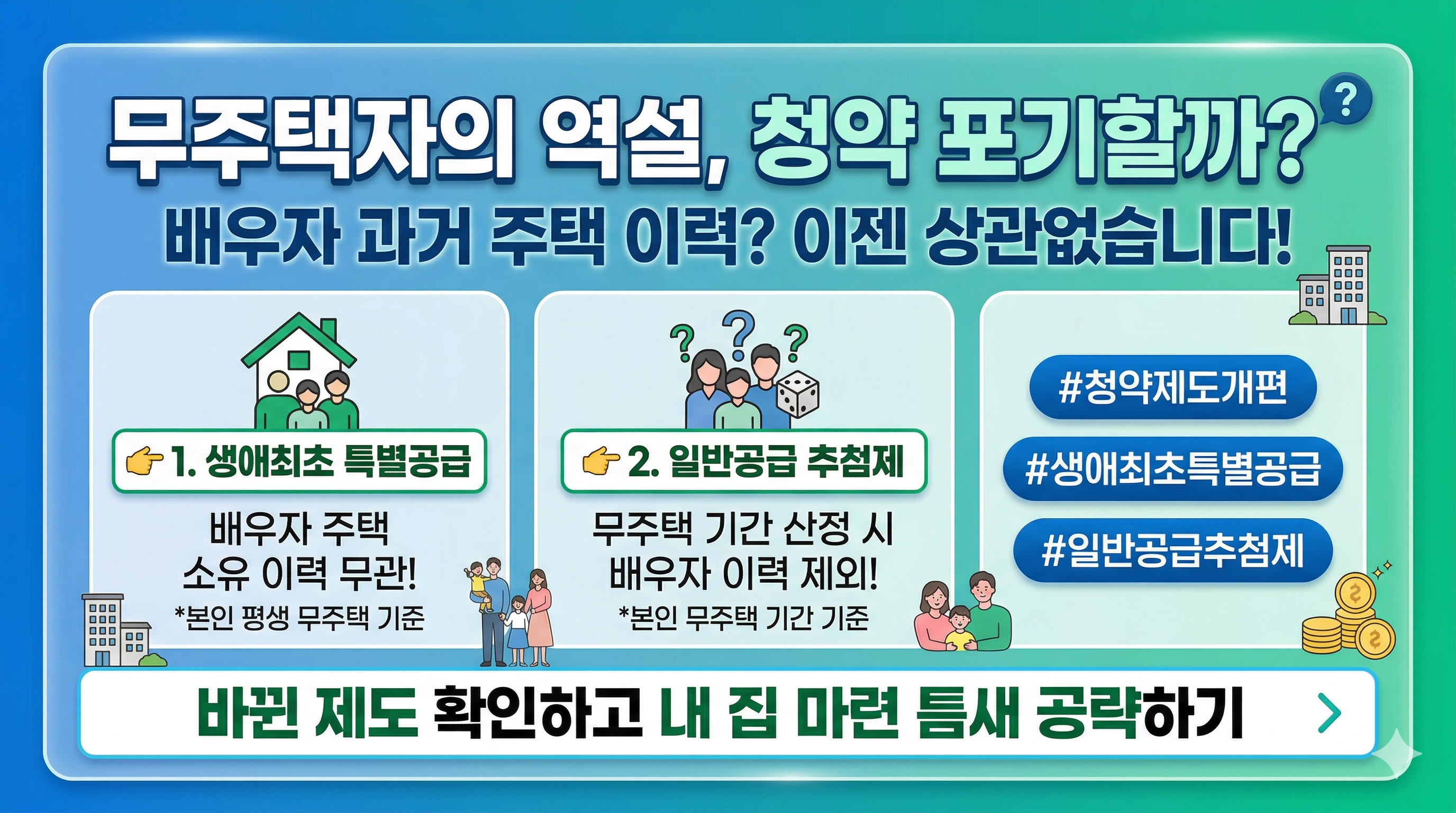 제도가 복잡하고 야속하게 느껴질 때가 많지만, 그 안에서도 나에게 맞는 '작은 문'은 반드시 존재합니다. 배우자의 과거 때문에, 혹은 신혼 기간이 지나서 포기하기엔 그동안 쌓아온 노력이 너무 아깝습니다. 바뀐 제도를 다시 한번 꼼꼼히 확인하고, 추첨제와 무순위라는 틈새를 노려보세요. 문은 두드리는 사람에게 열립니다. (출처: 부동산114 2026 청약 가이드)