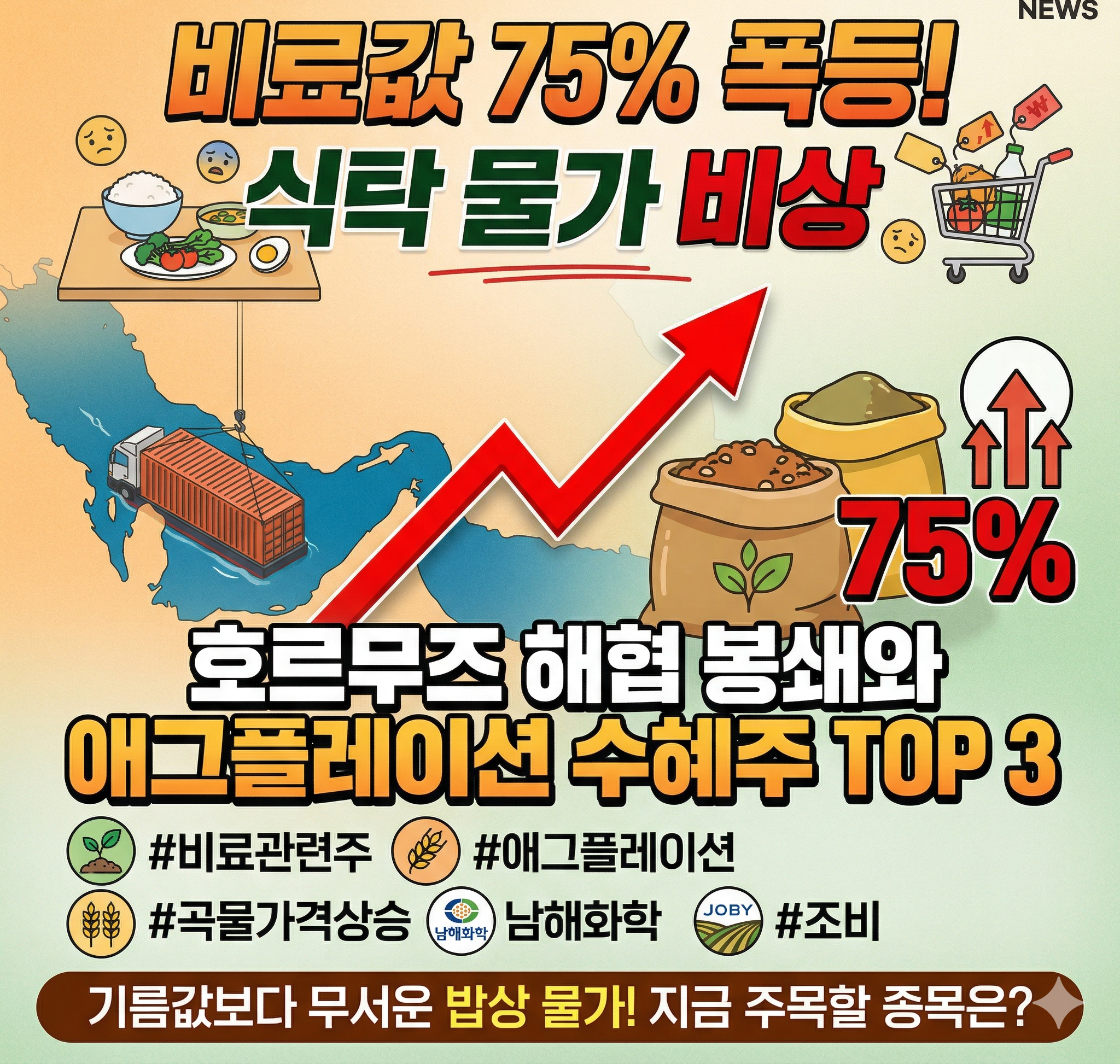 중동의 화약고라 불리는 호르무즈 해협의 긴장이 장기화되면서 석유뿐만 아니라 '비료' 가격이 심상치 않습니다. 전 세계 비료 원료의 약 33%가 통과하는 이 해협이 막히면 식량 생산에 차질이 생기고, 결국 우리가 먹는 식품 가격이 오르는 '애그플레이션'이 발생하게 됩니다. 오늘은 비료값 상승의 원인과 관련 주식들의 향방을 집중 분석합니다. (출처: 2026.03.26 뉴스레터 / 세계식량농업기구(FAO) 리포트)