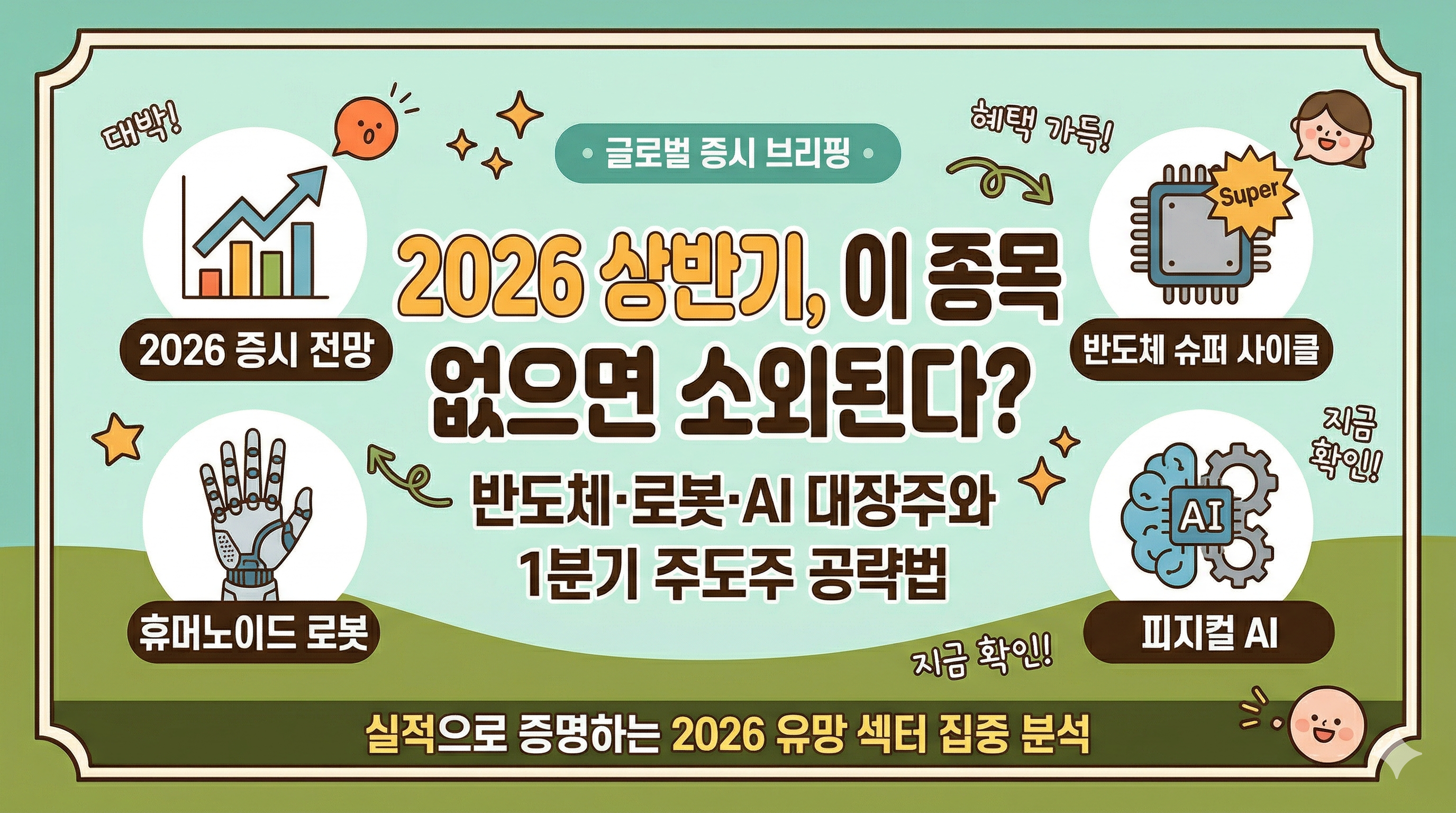2026년 주식 시장은 단순한 테마를 넘어 실질적인 '실적'과 '기술 격차'가 주가를 결정하는 구간에 진입했습니다. 특히 삼성전자와 SK하이닉스가 이끄는 반도체 슈퍼 사이클의 귀환과 현대차그룹의 로봇 기업 변신은 올해 증시를 관통하는 가장 강력한 흐름입니다. (출처: 2026 증시 대전망 리포트 / 네이버 프리미엄콘텐츠, 2026.01)