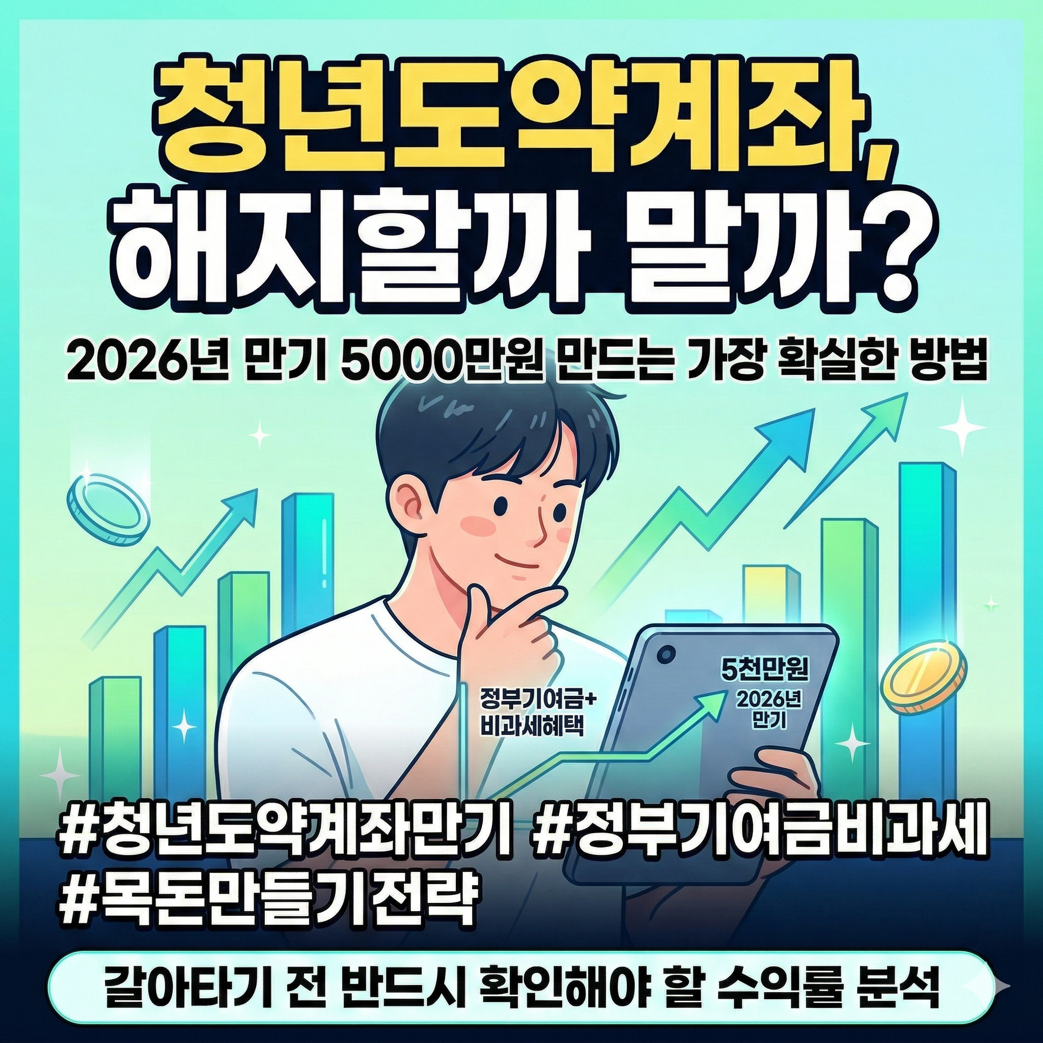 사회초년생과 청년들의 최고 관심사인 '청년도약계좌'가 2026년 들어 새로운 국면을 맞이했습니다. 최근 고금리 파킹통장들이 쏟아지면서 중도 해지 후 갈아타야 할지 고민하는 분들이 늘고 있는데요. 하지만 결론부터 말씀드리면, 정부의 '육성 지원'이 더해진 이 계좌를 유지하는 것이 수익률 측면에서 압도적입니다. 오늘은 만기 시 최대 5,000만 원 목돈을 만드는 실전 가이드를 정리해 드립니다. (출처: 서민금융진흥원 청년도약계좌 운영 지침, 2026.03)