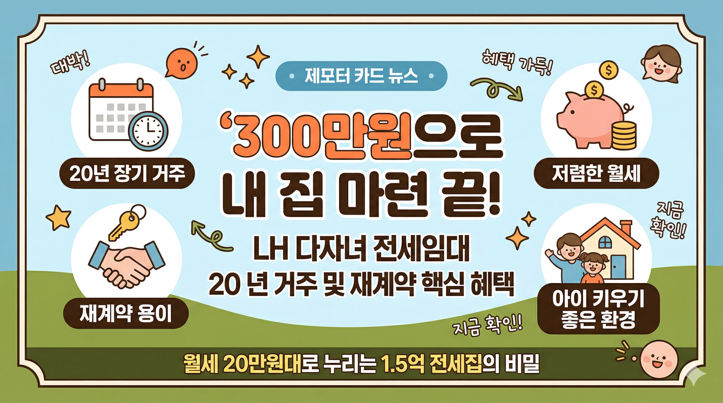 현금 300~500만 원 수준의 보증금과 저렴한 월 이자만으로 20년 보금자리를 마련하는 것은 다자녀 가구만이 누릴 수 있는 강력한 복지입니다. 포스팅을 통해 정리해 드린 재계약 조건과 혜택을 꼼꼼히 확인하시어, 우리 가족의 소중한 주거 기반을 탄탄히 다져보시길 바랍니다. (출처: LH 한국토지주택공사 전세임대 가이드)