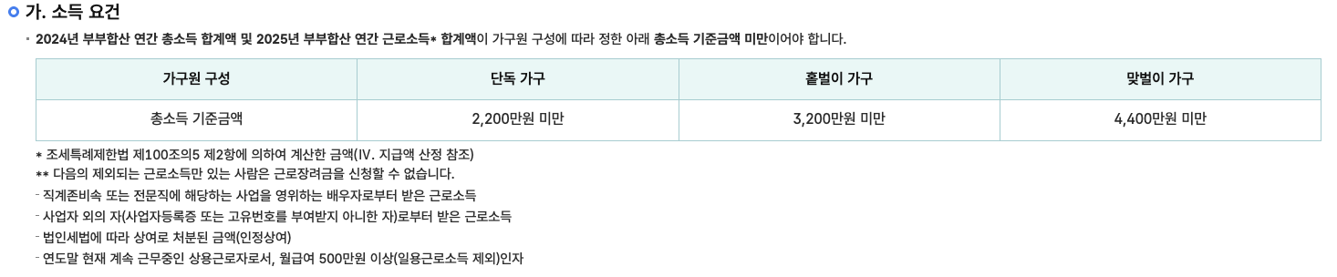 단독가구, 홑벌이가구, 맞벌이가구 중 하나에 해당해야 합니다. - 소득 요건