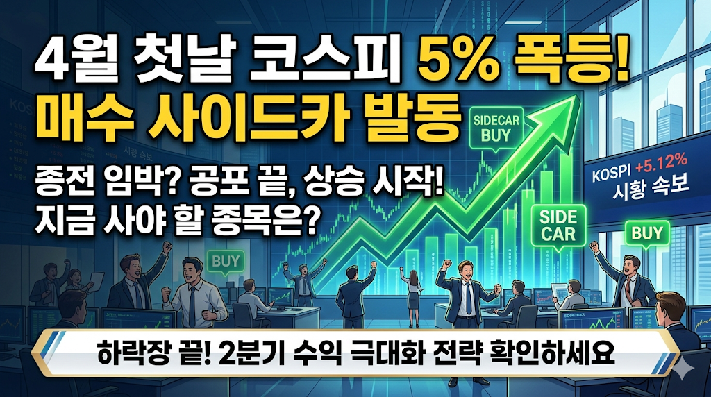 2026년 4월의 시작이 뜨겁습니다. 오늘 오전, 코스피 지수가 5% 넘게 폭등하며 무려 10거래일 만에 '매수 사이드카'가 발동되었습니다. 미·이란 간의 종전 협상 소식이 전해지며 공포에 질렸던 시장이 순식간에 환호로 바뀐 것인데요. 급등하는 시장에서 우리가 주목해야 할 핵심 포인트와 수혜주를 긴급 분석합니다. (출처: 뉴스1 / 한국거래소 시황, 2026.04.01)